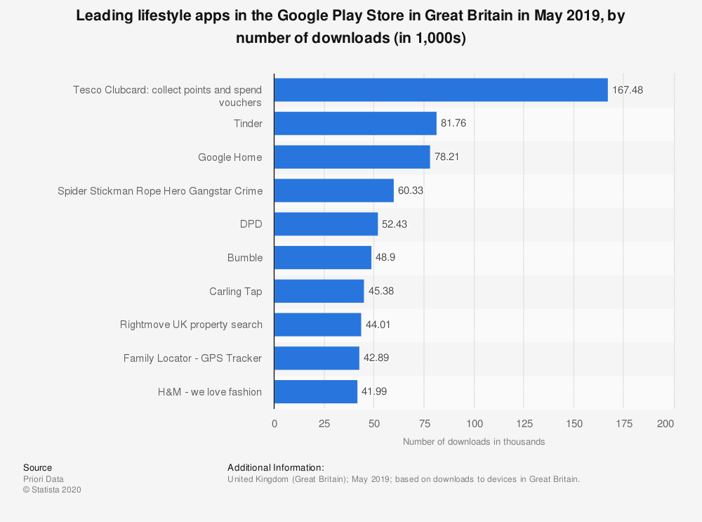 Priori Data. (June 18, 2019). Leading lifestyle apps in the Google Play Store in Great Britain in May 2019, by number of downloads (in 1,000s) [Graph]. In Statista. Retrieved March 05, 2020, from https://www-statista-com.uoelibrary.idm.oclc.org/statistics/690402/leading-lifestyle-apps-in-google-play-in-great-britain-by-downloads/