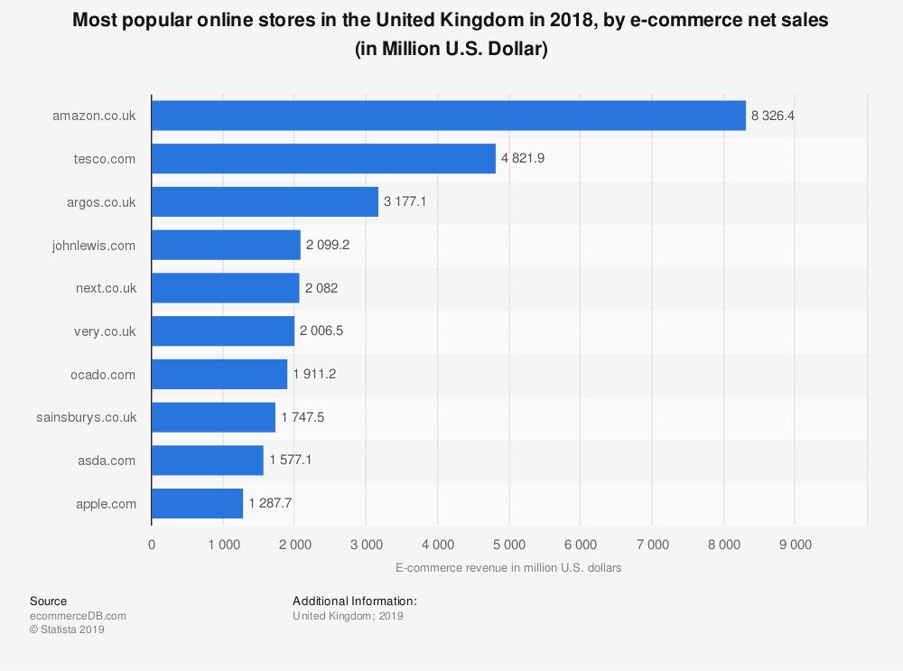 ecommerceDB.com. (December 9, 2019). Most popular online stores in the United Kingdom in 2018, by e-commerce net sales (in Million U.S. Dollar) [Graph]. In Statista. Retrieved March 05, 2020, from https://www-statista-com.uoelibrary.idm.oclc.org/statistics/870307/united-kingdom-top-online-stores-united-kingdom-ecommercedb/
